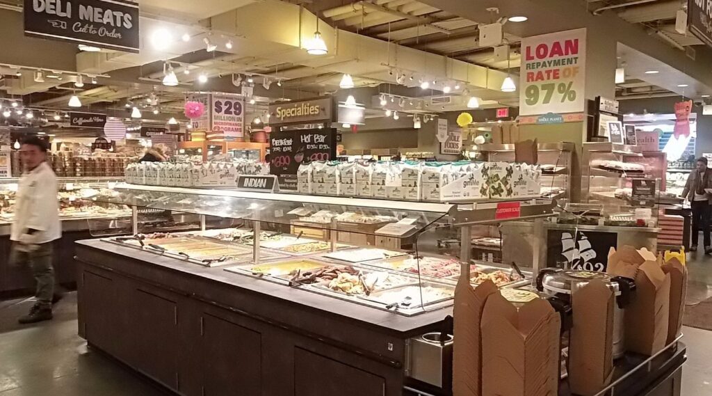 Whole Foodsなどのスーパーには、温かい惣菜やサラダバー、スープなどが量り売りで並んでいます。