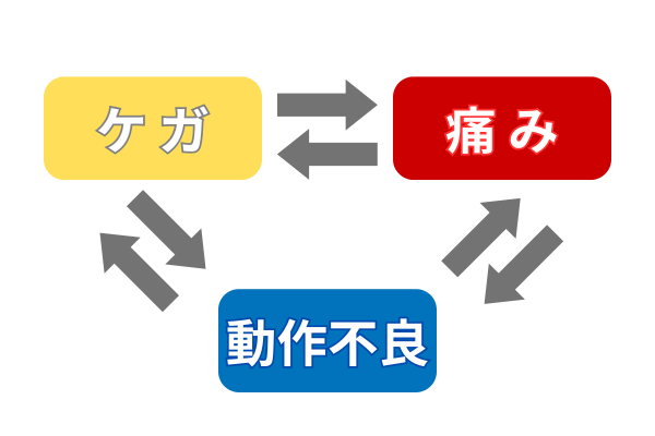 ケガや痛みは、無意識に動きを制限させた動作の不良を引き起こします。そしてその動作不良は特定の部位に負担を蓄積させケガ、痛みを引き起こします。このように痛みとケガ、動作不良はループするのです。